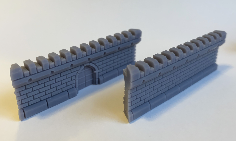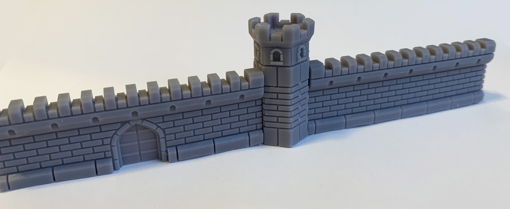 5 Stl digital files which can be 3d printed to produce; straight wall sections, angled wall sections, straight gate sections, angled gate sections, wall towers